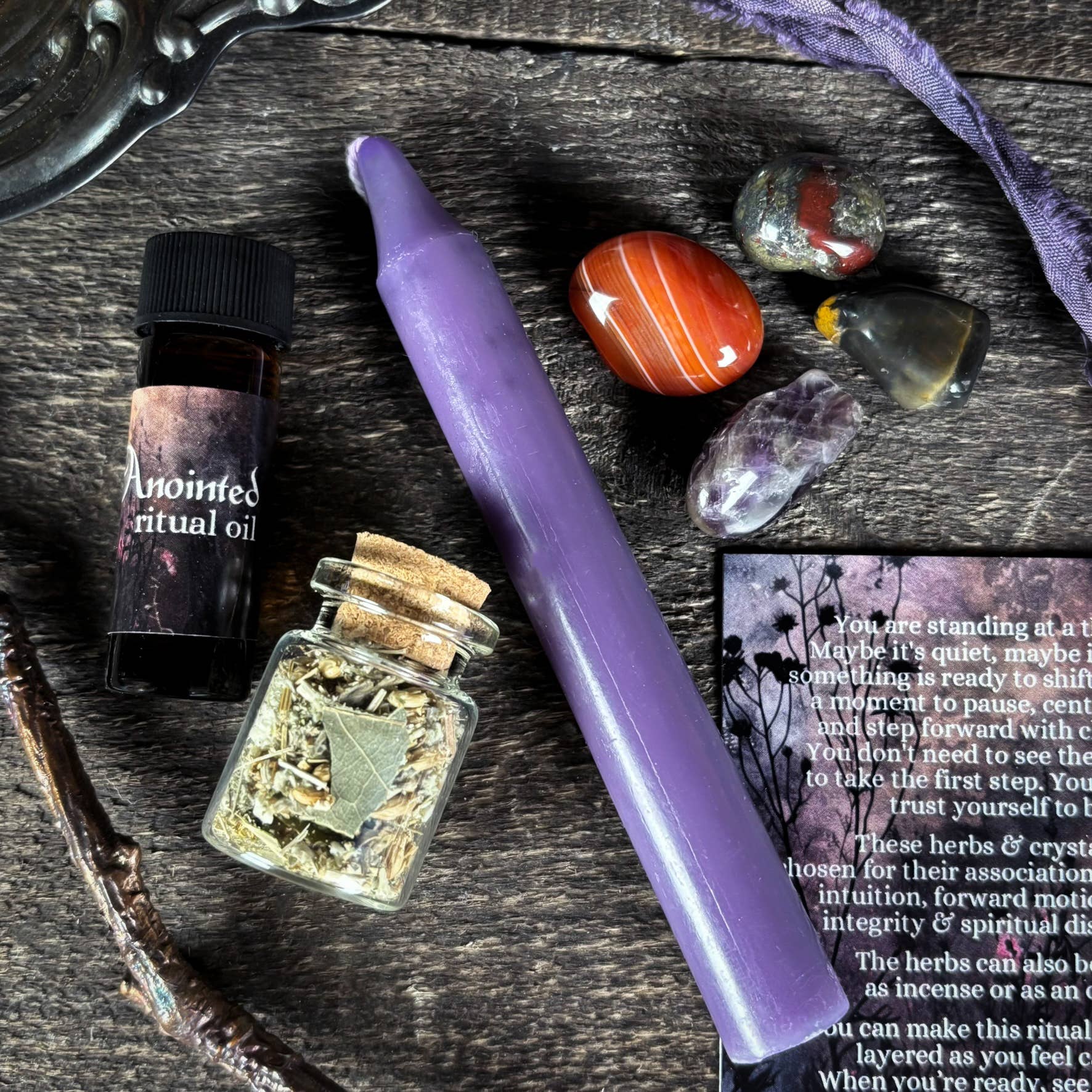 The herbs & crystals in this kit were chosen for their associations with courage, intuition, forward motion, wisdom, integrity & spiritual discernment.